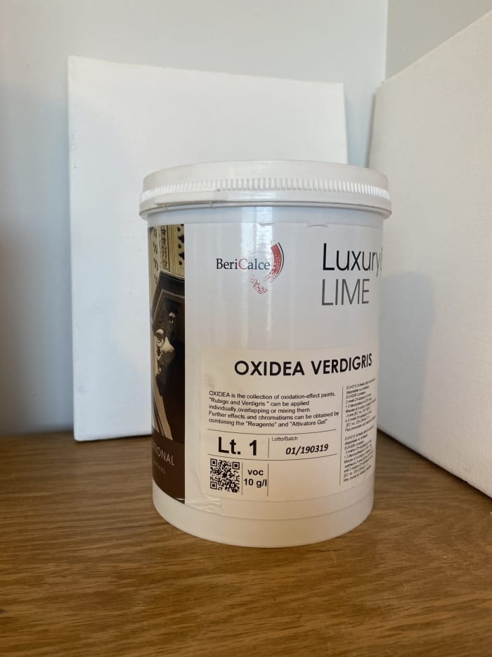 System consisting of a primer product, Verdigris Base, and an oxidizing finish, Verdigris Attivatore Gel. The application of the latter on the first produces an oxidation with a “Verderame” effect.