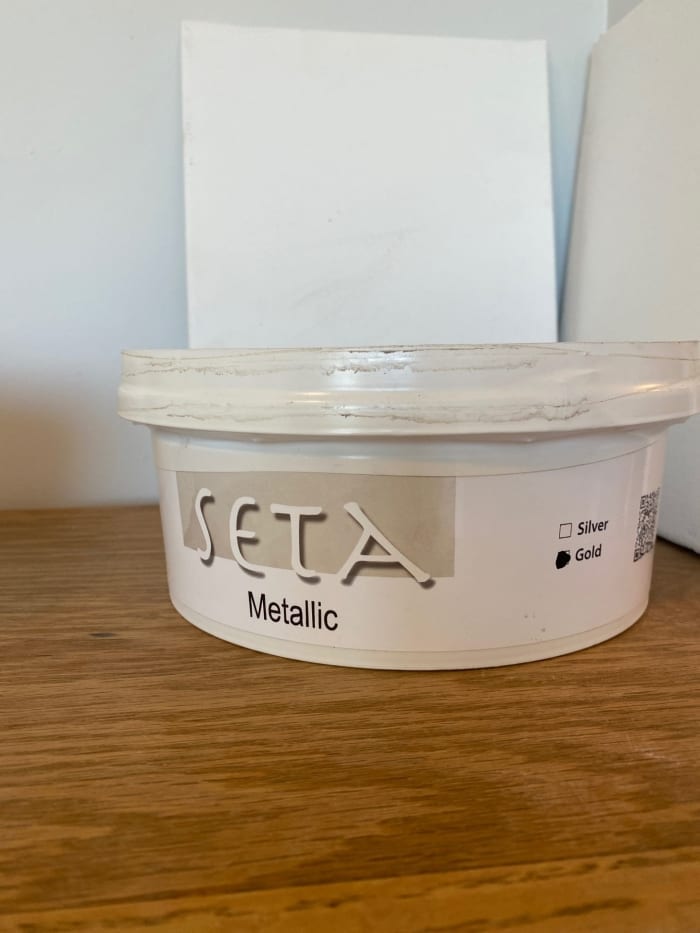 Synthetic decorative with a pearlescent silk effect. Paste product composed of resins and silvery or golden metallic pigments, for finishes with a classic style and a modern design.
